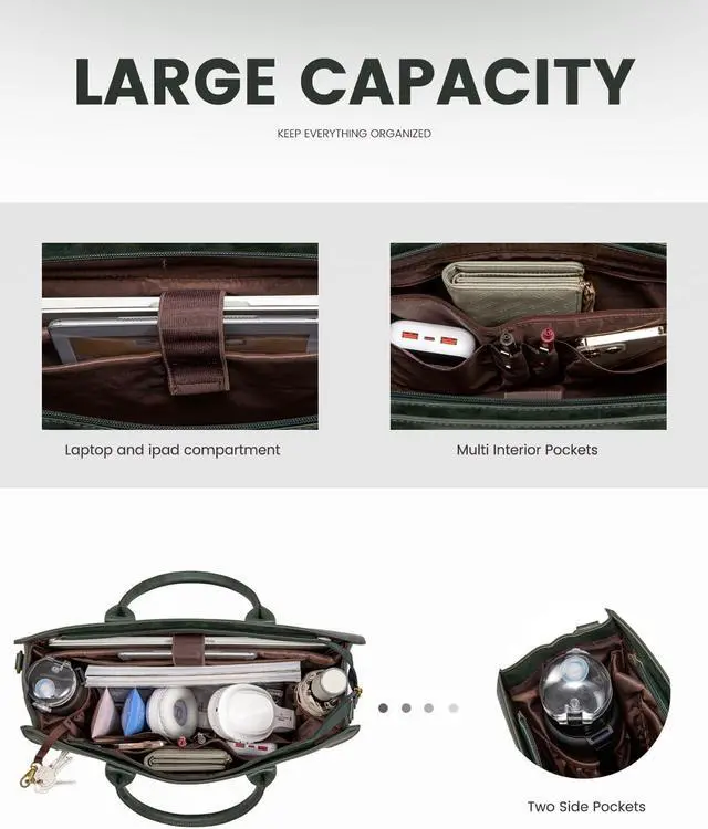 [(Perfect Size Laptop Bag)] : Measuring 16.3" x 6" x 12", this multi-pocket leather tote bag boasts ample space with a thick padded laptop compartment (For 13"/14"/15"/15.6" laptops), tablet slot, and various pockets for great organization, ensuring a secure and organized commute, daily use or business trip. Designed for the professional modern woman, the leather laptop bag for women marries elegance with functionality.