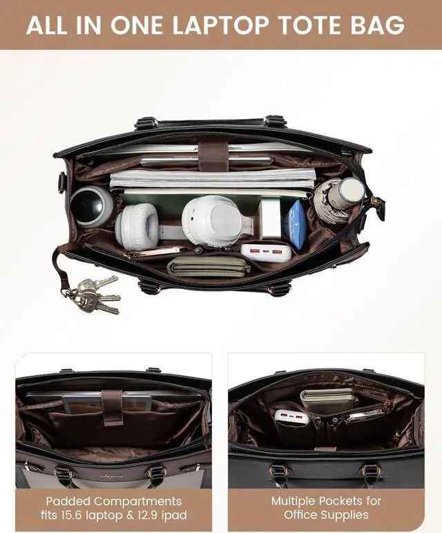 [(Multiple Pocket Tote Bag)] Features a dedicated padded laptop compartment for laptops up to 15.6 inches, an iPad pocket, a main compartment for daily essentials, side pockets for water bottles, tissues, or umbrellas.This tote bag for women keeps your belongings organized and easy to find!