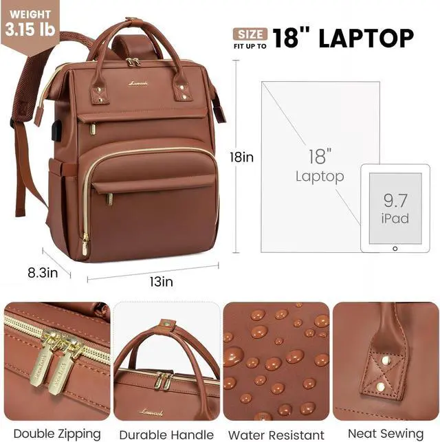 [(Upgraded LOVEVOOK Leather Laptop Backpack for Women)] : STURDY UPGRADED REINFORCED SEAMS. Made of high quality waterproof PU leather,thick shoulder straps,unique leather handles,no-slip zippers.HEAVY DUTY & DURABLE.Total of 2 compartments and 19 pockets,easy to organize all work necessities,college supplies,travel essentials.Dimensions: 18" x 13" x 8.3"; Weight: 3.15 lbs.