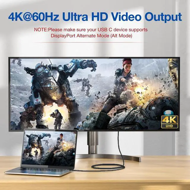 [(4K@60Hz Video Output)] Offers 4K@60Hz (3840*2160) video output function from USB C laptops to USB C display screen or monitor, such as LG 4k, HP EliteDisplay, Dell USB-C Monitors and more. (Note: The video function works for those devices that the USB C port supports DP Alt Mode.)