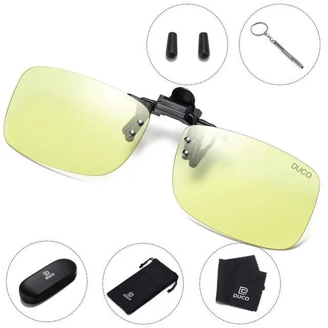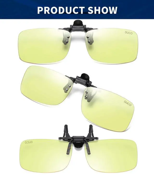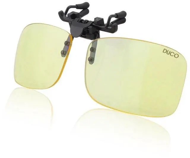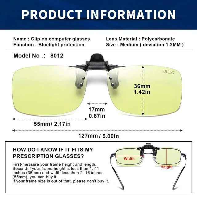 Bridge width: 17mm/ 0.67 in ^^ FUNCTIONBlock the glare with the DUCO computer eyewear recommended by doctors to protect and enhance your vision through the use of their specially designed lenses featuring proprietary tints and coatings that block hign energy blue light and glare. ^^ FEATURESPrevents dry eye, irritation and sharpens detail to ease eye strain, Filters blue light and UV to enhance contrast and protects eyes. Reduces glare to eliminate distraction and stress. ^^ Please check out the detailed dimensions shown in the picture before purchase! This product can be easily clipped onto your current prescription glasses. It can be applied to any metal, acetate, and TR90 frames. SILICONE FEET COVER can effectively protect your lens from scratching, and increase friction to prevent the clip felling. Made with lightweight and durable high quality materials, it WEIGHS ONLY 12g.