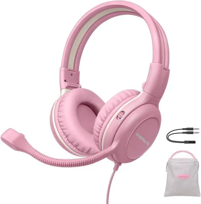 SIMOLIO Kids Headphones with Microphone for School, 75/85/94 dB Wired Headphones with Built-in MIC or Boom Mic for PC, Laptop, Gaming, Over Ear Pink Stereo Corded Headset for Girls, Children, Students