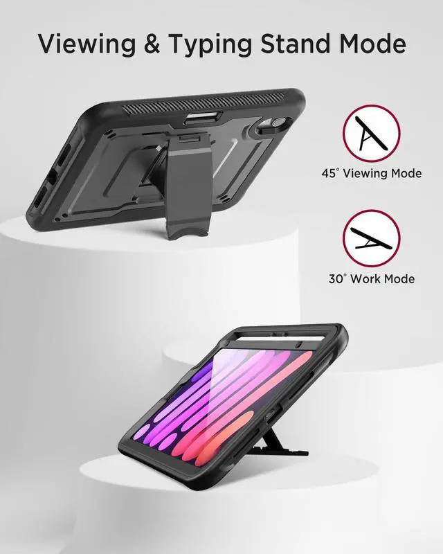(Note: Pencil not included) ^^ Sturdy Built-In Kickstand for Comfortable ViewingIntegrated kickstand with 2 adjustable angles (30/45) for streaming, video calls, or reading. The iPad Mini 7 case with kickstand features dual-layer TPU+PC material, which passes military-grade drop test, protecting your iPad from accidental falls. Moreover, this iPad Mini 7 kids protective case with foldable design keeps the case slim when not in use. ^^ 360 Protection with Tempered Glass Screen ProtectorBuilt-in 9H hardness screen protector shields the display from smudges and cracks. The iPad Mini 7 case with built in screen protector preserves the original touch experience while providing sensitive and accurate recognition of your hand movements. Rugged PC back shell resists fingerprints and scratches. The iPad Mini 7 case hard back with kickstand provides all-around protection for daily use, school, or outdoor activities. ^^ Easy Installation & Precise CutoutsThis iPad Mini 7 full case with a snap-on design allows quick installation/removal without scratching your iPad. Precise cutouts for buttons, ports, and camerafull access to all functions without removing the iPad Mini 7 rugged folio case. And the matte iPad case Mini 7 with stand, its lightweight design wont add bulk to your device.