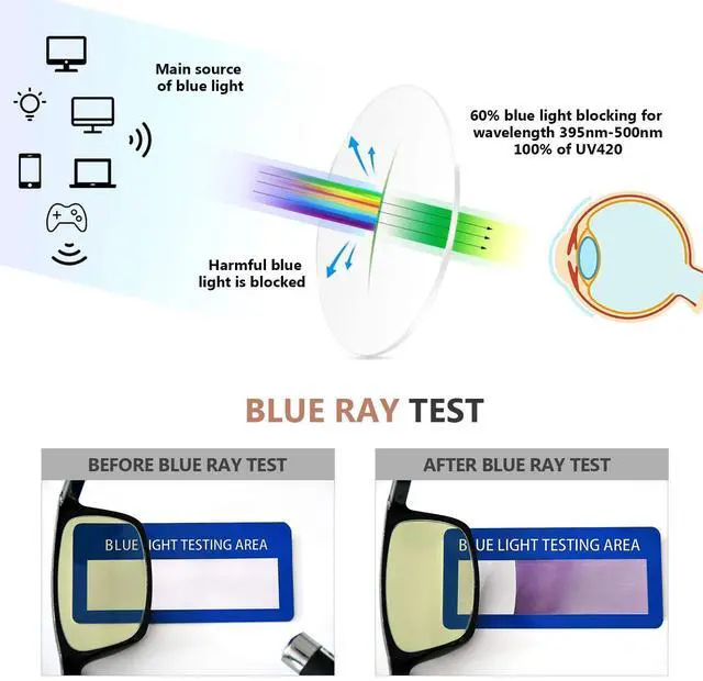 • Explosion Proof Blue Light Filter Lenses - reduce eyestrain, anti blue ray to a great extent. Enjoy your digital time, NO worry about eye fatigue, blurred vision and headache, let you have a better sleep