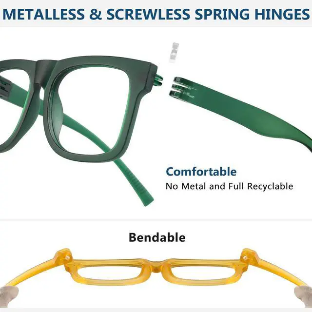 • [ PATENTED ] - Eyekepper's innovative Metalless design blue light blocking reading glasses for women, adorned with screwless spring hinges, offer a one-of-a-kind style that is truly unique. These unisex computer readers boast a hinge mechanism that is completely devoid of metal and screws.