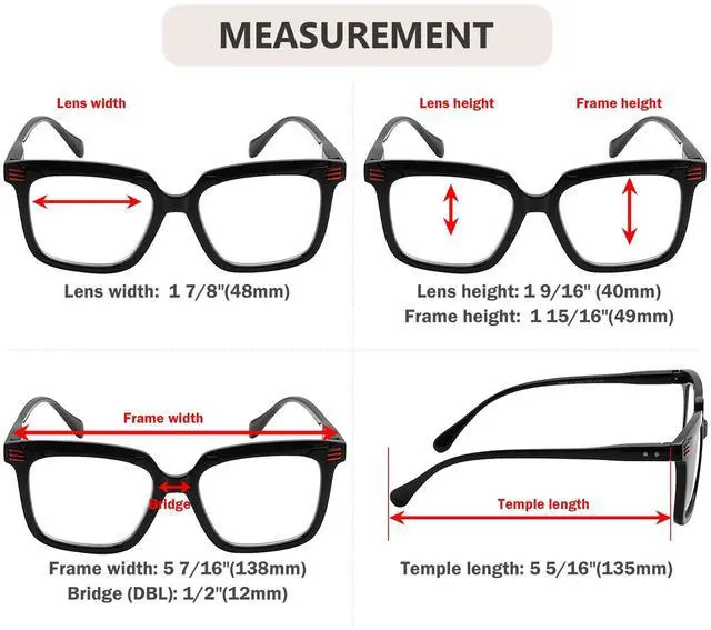 PRODUCTS DIMENSION - Frame material is plastic. Lens width about 1 7/8 inches (48mm). Frame width about 5 7/16 inches (138mm). Lens height about 1 9/16 inches (40mm). Frame height about 1 15/16 inches (49mm). Bridge (DBL) about 1/2 inches (12mm). Temple length about 5 5/16 inches (135mm), with spring hinges. ^^ EYEKEPPER SQUARE READING GLASSES - Stylish frames, look good on any face. ^^ EYEKEPPER WOMENS READERS - Spring hinge temples help glasses fit your face. ^^ GOOD FOR READING - Great for home, office, or bedside use.