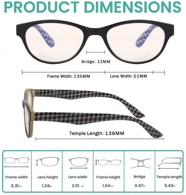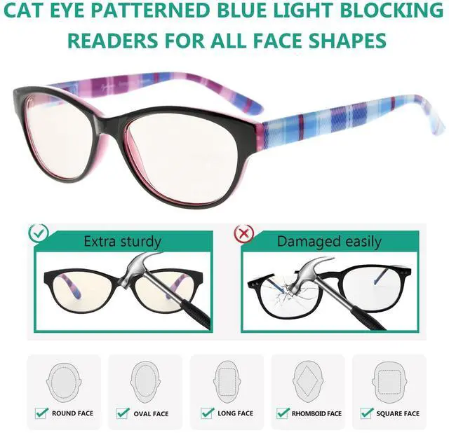 Blue Light Reading Glasses blue light blocker and UV400 Lenses, alleviates visual fatigue and discomfort from browsing mobile phones, tablets, gaming and working under fluorescent lights with UVA and UVB protection and glare reduction. ^^ Explosion Proof Blue Light Filter Lenses reduce eyestrain, highly resistant to blue light. Enjoy your digital time, NO worry about eye fatigue, blurred vision and headache, let you have a better sleep. ^^ Spring Hinges Blue Light Blocking Eyeglasses ultra-light and flexible resin frame material for durability and comfortable long-term wearing. Cat Eye frame and patterned design keeps you looking cute and stylish while working or playing video games.