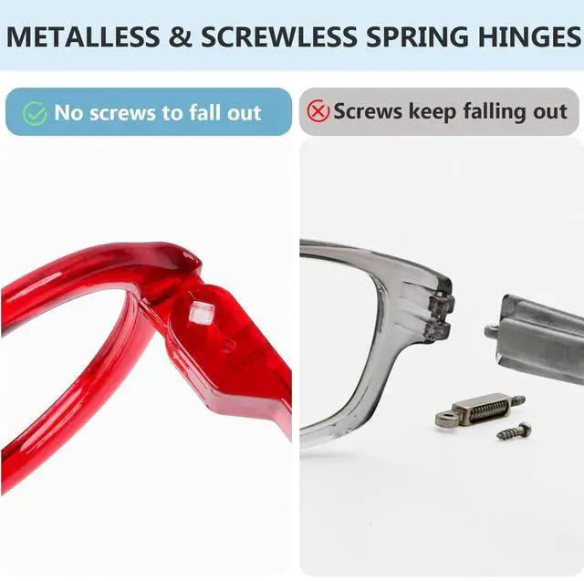 They have a unique frame feature, which means there is no metal in the entire set and no screws in the spring hinges. ^^ [ DURABLE ] - Screwless spring hinges make the computer readers durable. No need to worry about the temples falling off or screws falling out. The arms open and close so clean, easy and less breakble. ^^ [ COMFORTABLE ] - When you wear these blue blockers readers, the hinges provide soft elasticity from start to finish. It is just the right elasticity, can give you a comfortable experience.