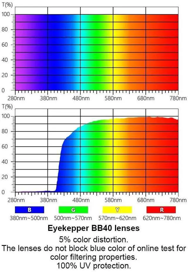 • The lenses do not block blue color of online test for color filtering properties.Please check Eyekepper BB60,BB90 and BB98 lenses if you need block blue color and block more blue light.