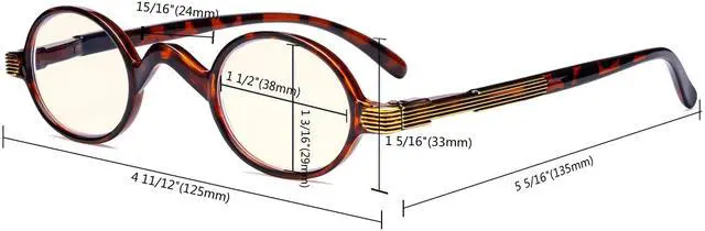 • PRODUCTS DIMENSION - Frame material is Plastic,Lens width about 1 1/2 inches(38mm),Frame width about 4 15/16 inches(125mm),Lens height about 1 1/8 inches(29mm),Frame height about 1 5/16 inches (33mm),Bridge(DBL) about 15/16 inches(24mm),Temple length about 5 5/16 inches(135mm),with spring hinge