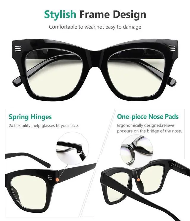 • This blue light filter reading glasses use A-class CLEAR LENS/SCRATCH lenses which have higher precision as well ,scratch-resistant coating technology improves visual clarity and keeps lenses clear optimal viewing.