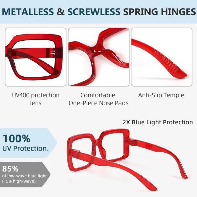 ^^ [ Durable ] - Our computer readers with new screwless design allow you to open the hinges super wide and snap them back with ease, eliminating worries about screws falling out or temples becoming loose. ^^ [Comfortable ] - When you wear these blue blockers readers, the hinges provide soft elasticity from start to finish. It is just the right elasticity, can give you a comfortable experience. ^^ [ Metalless ] - Choosing our metalless computer reading glasse will not trigger your metal allergies. Additionally, the whole spectacles are easy to recycle.