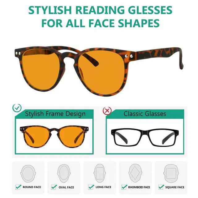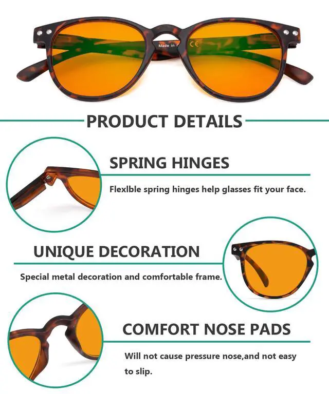 • Anti Blue Light Reading Glasses - blue light blocker and orange Lenses, Alleviates visual fatigue and discomfort from browsing mobile phones, tablets, gaming and working under fluorescent lights with UVA and UVB protection and glare reduction