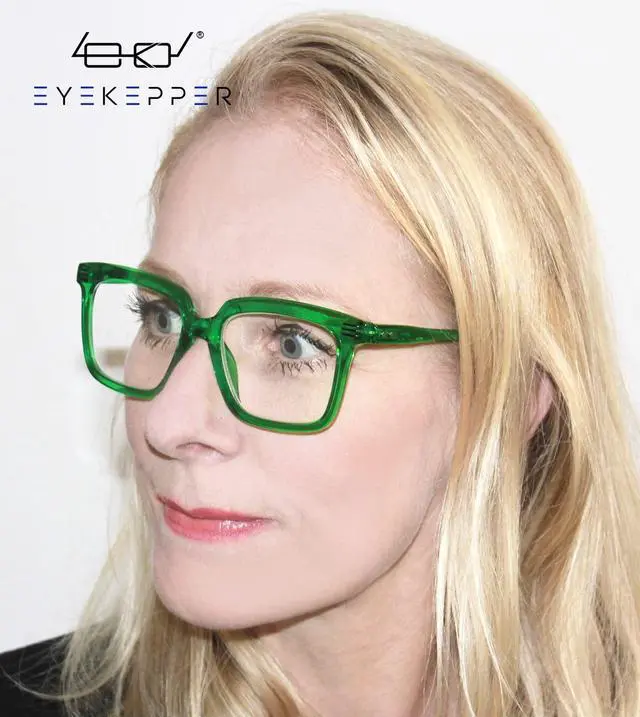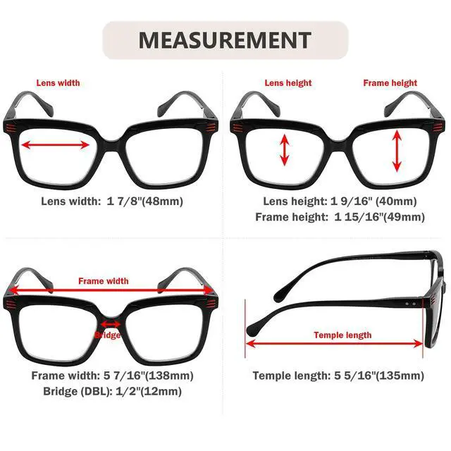 PRODUCTS DIMENSION - Frame material is plastic. Lens width about 1 7/8 inches (48mm). Frame width about 5 7/16 inches (138mm). Lens height about 1 9/16 inches (40mm). Frame height about 1 15/16 inches (49mm). Bridge (DBL) about 1/2 inches (12mm). Temple length about 5 5/16 inches (135mm), with spring hinges. ^^ EYEKEPPER SQUARE READING GLASSES - Stylish frames, look good on any face. ^^ EYEKEPPER WOMENS READERS - Spring hinge temples help glasses fit your face. ^^ GOOD FOR READING - Great for home, office, or bedside use.