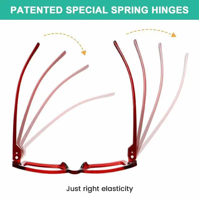 The innovative approach delivers secure, seamless opening and closing, reducing worries about loose temple arms and providing lasting durability ^^ Comfortable, Gentle Fit The spring hinges provide just the right stretch every time you put them on, ensuring all-day comfort without pinching or slipping. Perfect for reading, working, or relaxing ^^ Easy to Recycle Made from high-quality recyclable plastic, these computer readers can be disposed of directly without the need to separate metal components, making recycling simple and straightforward