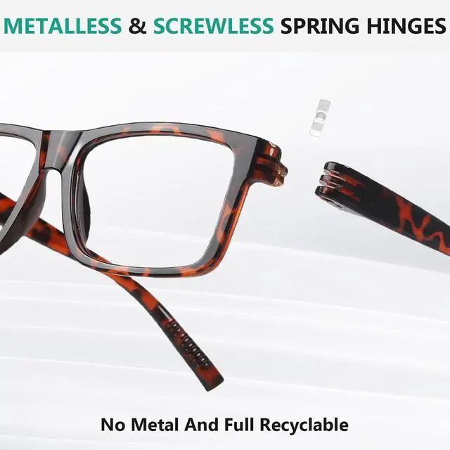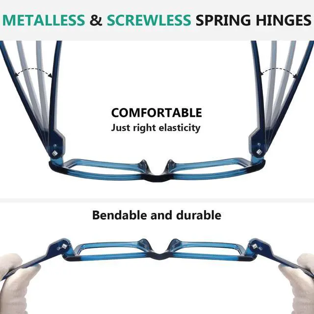 ^^ [ DURABLE ] - Screwless spring hinges make the computer readers durable. No need to worry about the temples falling off or screws falling out. The arms open and close so clean, easy and less breakble. ^^ [ COMFORTABLE ] - When you wear these blue blockers readers, the hinges provide soft elasticity from start to finish. It is just the right elasticity, can give you a comfortable experience. ^^ [ METALLESS & SCREWLESS ] Metalless computer reading glasse are recyclable plastic, so they don't need extra processing to remove metal parts prior to the recycling process.