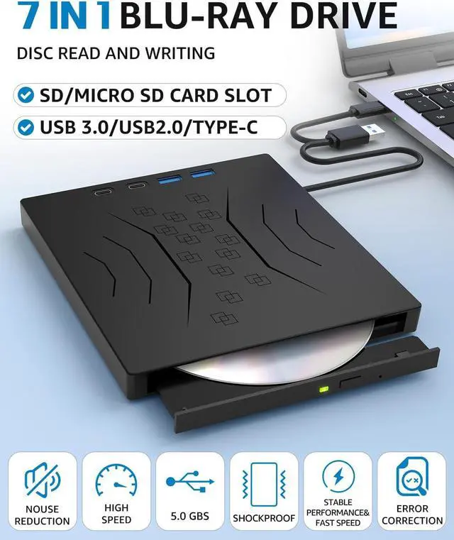 7 in 1 DVD External Blu-ray Drive: USB 3.0 Type-C External Bluray/DVD Drive Burner with SD/TF Port - Support Disc R/W - External Disc Drive Compatible with Windows XP/7/8/10/11 Mac Laptop Desktop