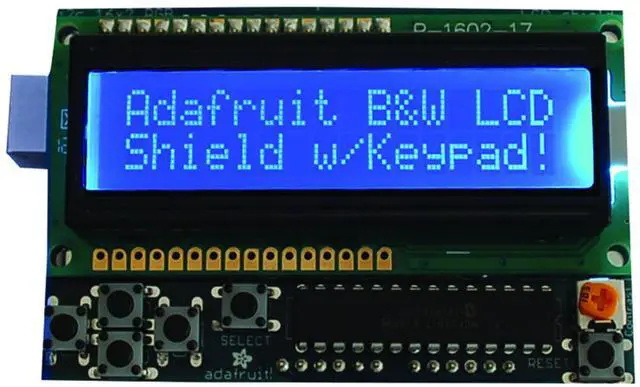 LCD Shield Kit 16x2 Character Display - Uses only 2 pins! This new Adafruit shield makes it easy to use a 16x2 Character LCD. Unfortunately, most LCDs require quite a few digital pins, 6 to control the LCD and another pin to control the backlight for a total of 7 pins. That's almost half of the pins available on a classic Arduino! What to do? To make it easier for people to get these LCD into their projects, Adafruit devised a shield that lets you control a 16x2 Character LCD, up to 3 backlight pins AND 5 keypad pins using only the two I2C pins on the Arduino! The best part is you don't really lose those two pins either, since you can stick I2C-based sensors, RTCs, etc and have them share the I2C bus.