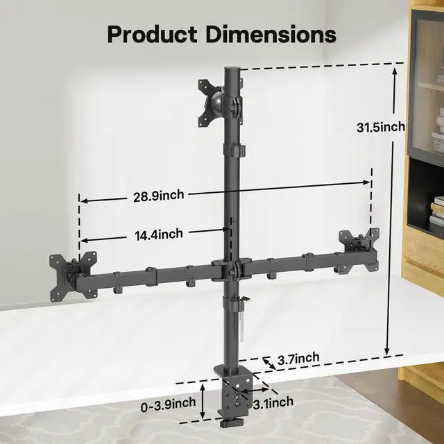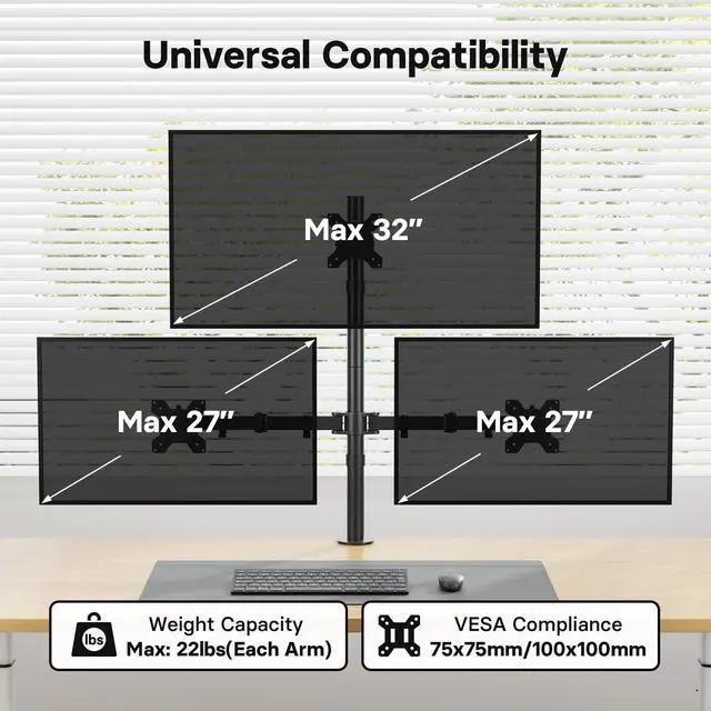 SCREEN COMPATIBILITY - This triple monitor desk mount supports two 13-27 inch monitors on the arms and one 13-32 inch screen on the central pole, with a weight capacity of 22 lbs per monitor. It's compatible with VESA 75x75mm and 100x100mm mounting patterns, providing stable support for various monitors