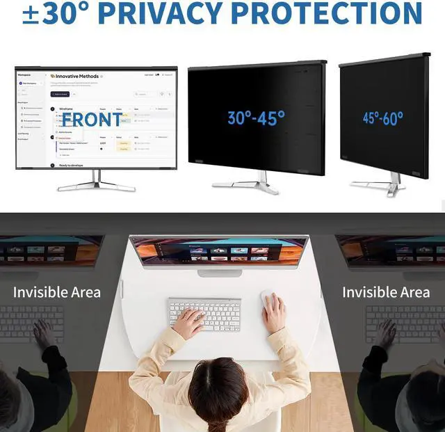 Privacy Protection with +-30deg Viewing Angle:Adopting ultra-micro shutter technology, limiting the viewing angle to +-30deg, effectively preventing side peeping, Someone who tries to peek over the side will only see a dark screen! Clear and unobstructed frontal view, suitable for public scenes such as cafes, offices and so on.