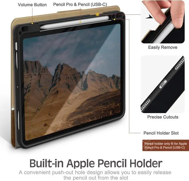 Built-in Apple Pencil Holder: Built-in pencil holder for Apple Pencil Pro and Pencil (USB-C); Allows you easy to pull out and store your Apple Pencil inside the case securely; Notice: Apple Pencil and Adapter only for illustration, not included