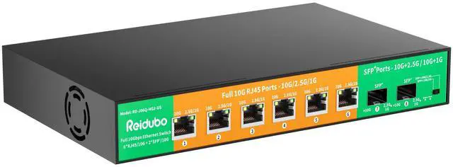 [(High-Speed 8-Port 10G Switch)] Equipped with 6 x 2.5G RJ45 Ports and 2 x 10G SFP+ Uplink Ports. It fully supports 1G/2.5G/5G/10G rate adaptation. With a switching capacity of 160Gbps, the 10G ports offer higher uplink bandwidth and improved bandwidth utilization. Whether you're transferring large files, streaming high-definition videos, or engaging in online gaming, it can handle everything effortlessly, meeting your ultimate pursuit of high-speed networks.
