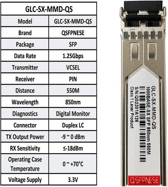 QSFPNESE 1.25G SFP Optical Transceiver, 1000BASE-SX SFP 850nm MMF up to 550M, Compatible with Cisco GLC-SX-MMD, Meraki, Fortinet, Ubiquiti UniFi, Mikrotik, TP-Link and More