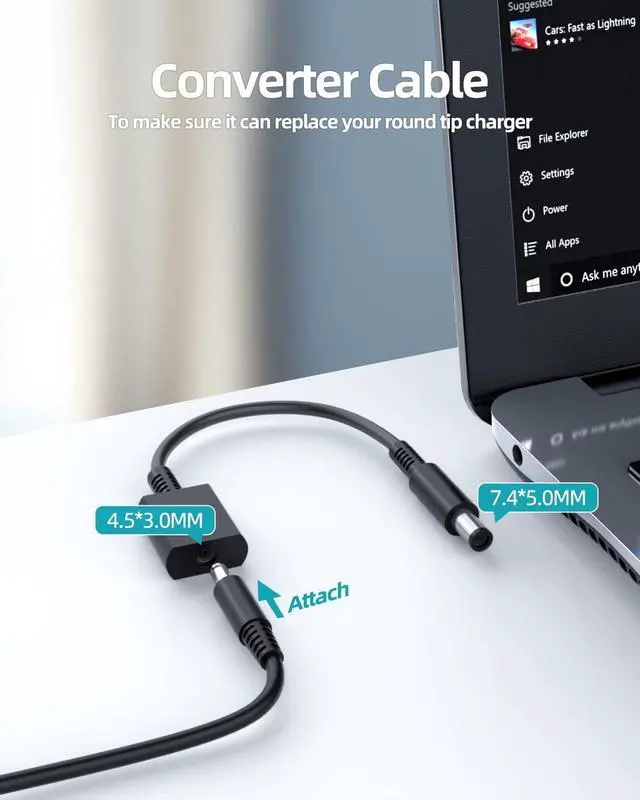 Package includes - 1 X power cord,1 X 4.5 X 3.0mm to 7.4 X 5.0mm Converter Cable, which can use for the 7.4 X 5.0mm connector laptops
