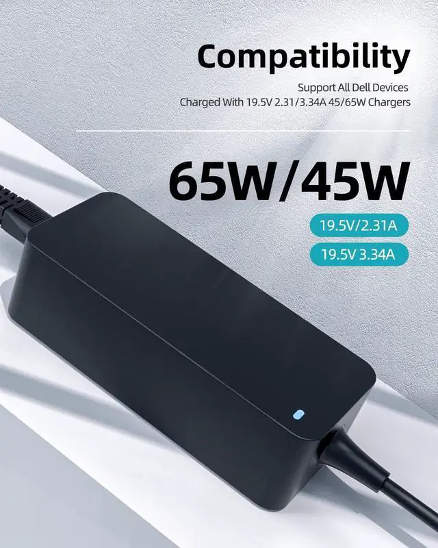 Output Max - 19.5V 3.34A 65W Input Volt Range: 100-240V Instructions for use: This product can be used to charge Dell computers with 65w 4.5 X 3.0mm and 7.4 X 5.0mm connector. When your computer fits a 4.5 X 3.0mm connector of the power cord to the adapter cable, that you can use the 7.4 X 5.0mm connector to charge the computer.
