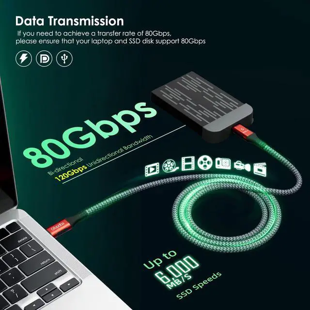 80Gbps Data Transfer: USB4 2.0 cable for Thunderbolt 5 cable offers transfer speeds of up to 80Gbps, allowing you to transfer large files and stream high-resolution content in seconds. With a whopping 120Gbps of video bandwidth, this cable ensures flawless video streaming
