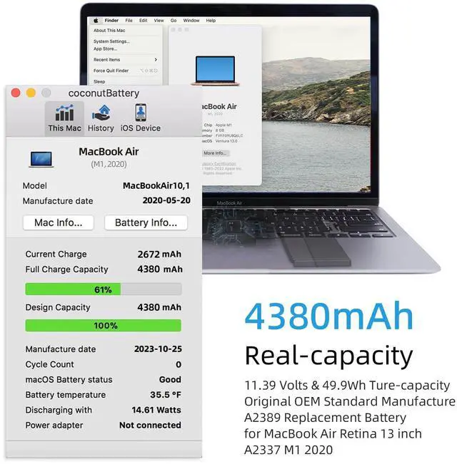 OEM Standards Manufacture: Real capacity 11.39Volts=49.9Wh 4380mAh. Same manufacture standards as the original A2389 batteries for MacBook Air 13" model A2337. Provide up to 1000+ charging cycles and support fast charging with overcharge and discharge circuit protection