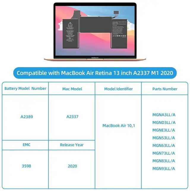Replacement Battery Models: Replace for MacBook Air 13inch M1 Model A2337 2020 Released Versions, battery type A2389. Part Numbers: MGNA3LL/A, MGND3LL/A, MGNE3LL/A, MGN53LL/A, MGN63LL/A, MGN73LL/A, MGN83LL/A, MGN93LL/A, etc