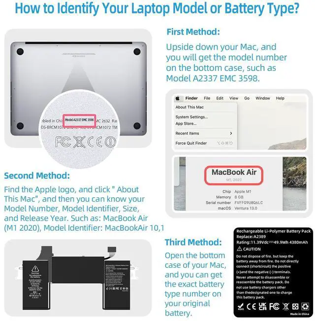 How to Get Correct Battery: First, upside down your Mac to get the exact model name & EMC numbers; Second, find and click on About This Mac, and the system model and release year is on the pop window; Third, follow the method 2 and then click on "System Report" the model identifier is on the "Hardward Overview"; Fourth, check the original battery to g