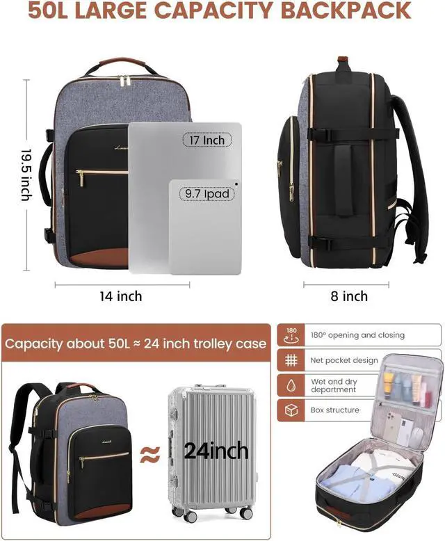 Spacious & OrganizedWith a 50L capacity, 4 compartments, and a lot of pockets, designed to allow you to easily separate and organize your travel personal items, this travel backpack can accommodate 3-7 days worth of travel items.