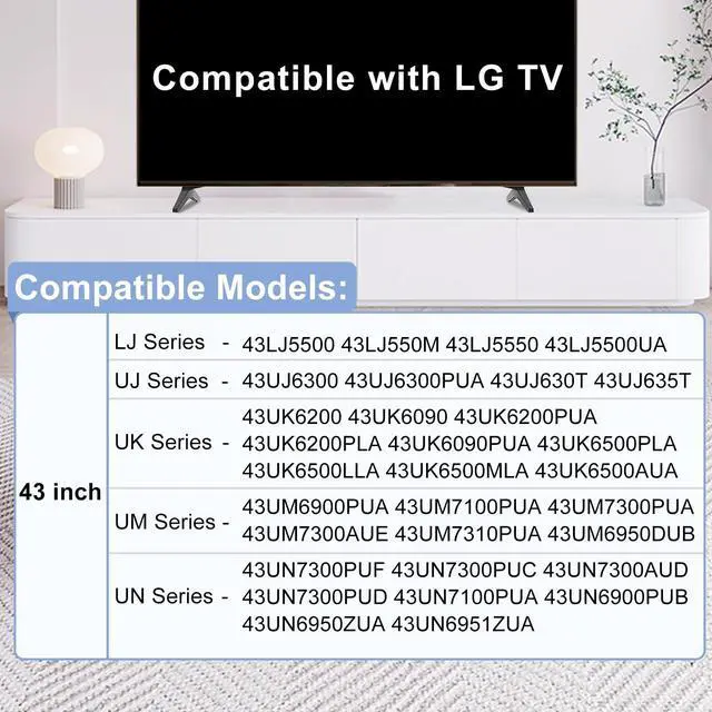 Compatibility: Stand for LG TV legs replacement for LG 43LJ5500 43LJ550M 43LJ5550 43LJ5500UA 43UJ6300 43UJ6300PUA 43UJ630T 43UJ635T 43UK6200 43UK6090 43UK6200PUA 43UK6200PLA 43UK6090PUA 43UK6500PLA 43UK6500LLA 43UK6500MLA 43UK6500AUA 43UM6900PUA 43UM7100PUA 43UM7300PUA 43UM7300AUE 43UM7310PUA 43UM6950DUB 43UN7300PUF 43UN730OPUC 43UN7300AUD 43UN730OPUD 43UN7100PUA 43UN690OPUB 43UN6950ZUA 43UN6951ZUA. Part number: MAM645839 AAN76009325 AAN76009305 AAN76009358.