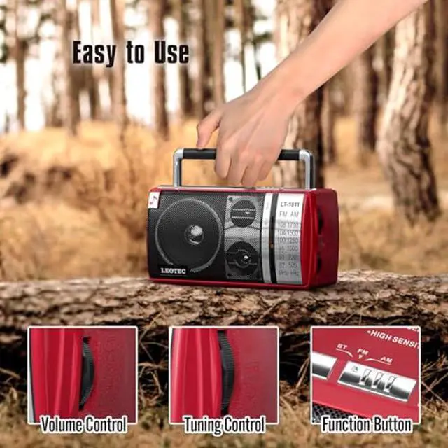 LEOTEC AM FM Radio, Portable Bluetooth Radio, Plug in Wall or Battery Operated Best Reception with Headphone Jack, Handheld Great for Home, Outdoor, Red