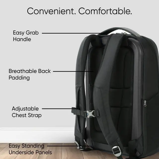 Comfortable Carrying: Equipped with breathable back padding, adjustable chest straps, and an integrated luggage handle sleeve for enhanced comfort and convenience.
