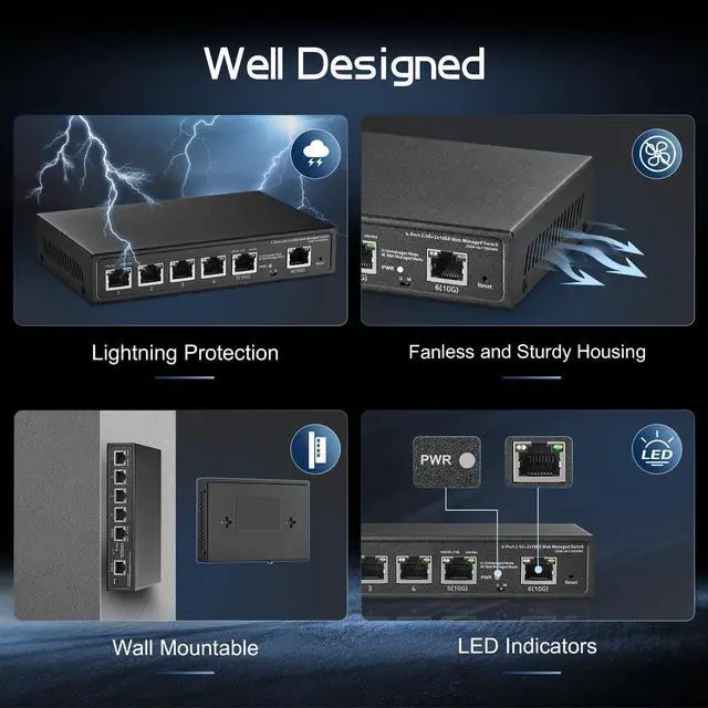 Binardat 6 Port 10G Switch, 4 x 2.5G RJ-45 Base-T Ports, 2 x 10G RJ-45 Ports, Web Managed/Unmanaged, Metal Fanless Managed Multi-Gigabit Desktop/Wallmount Network Switch