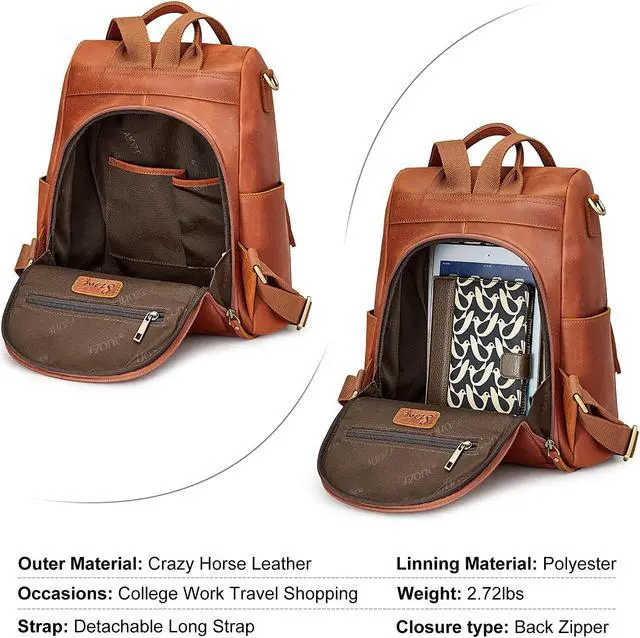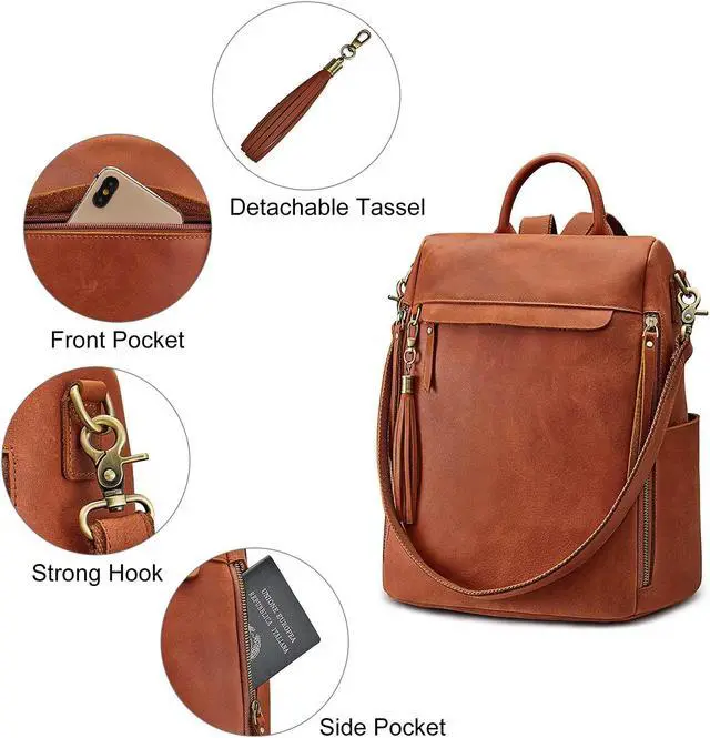 MaterialThis backpack purse is made of crazy horse leather (full-grain leather ), which is scratched easily and develop the style of retro and wildness; Upgraded Lining avoids tearing easily; the SOFT & WIDE backpack strap relieves the stress on your shoulder. Better than any other leather backpack on the market