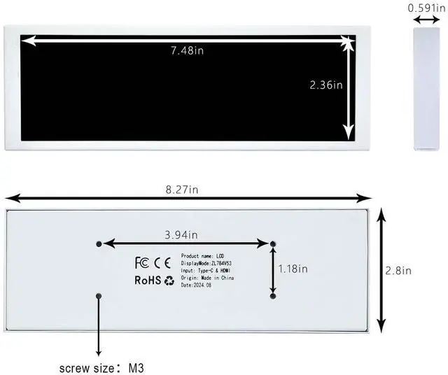Mini Monitor: 7.84 inch small size stretched bar LCD display with white metal case, Outline Size 209×71×15(H×V×D)mm, Display Area 190.78(W)×59.4(H) mm