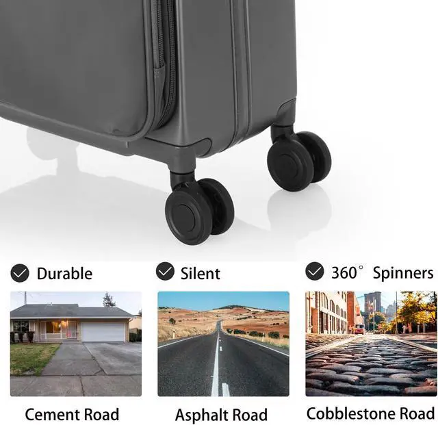 DURABLE FABRIC & RETRACTABLE ALUMIUM PIPESThe wheeled suitcase with 4 spinner wheels is made of PC and nylon.The hard shell is extremely scratch-resistant,the top open cover is easy for collecting.The luggage pipes has 4 different adjustment