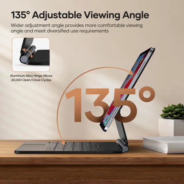135° Adjustable Floating Cantilever Stand: you can attach tablet to the back cover magnetically. Set up the floating cantilever stand with just one smooth movement and into a high-performance and easy-to-use laptop within a second. Wider Adjustable Viewing Angle (0-135°) for more free and comfortable scenes like reading or immersive viewing