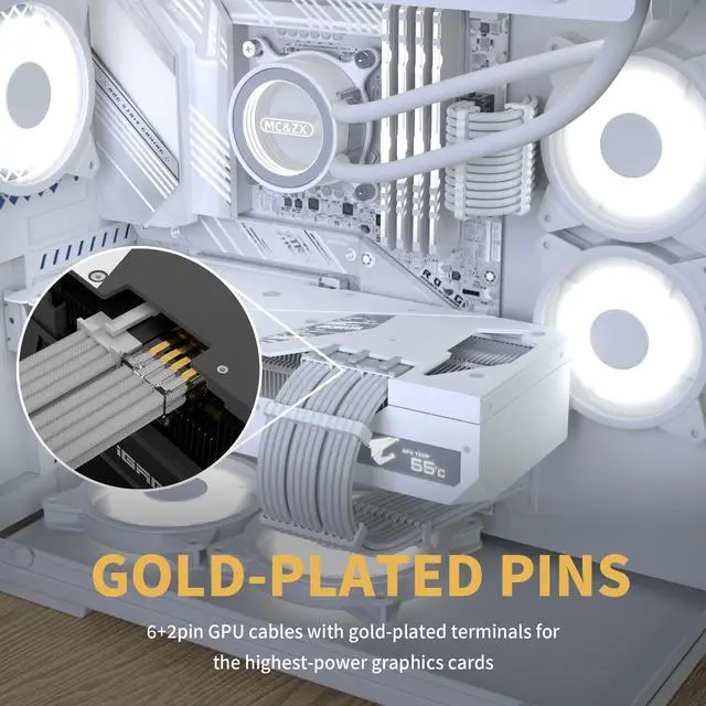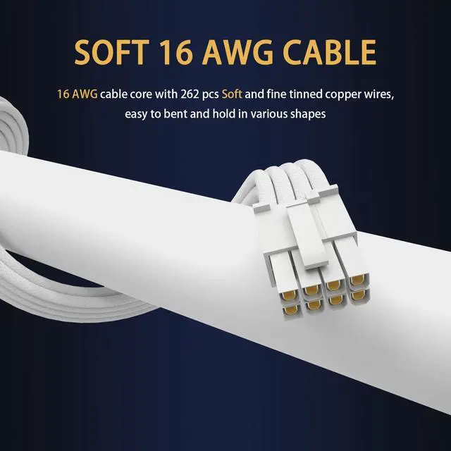 Gold Plated 8 pin PCIE CableAll cables have 16AWG thickened alloy copper core. The 8 pin GPU cable features gold-plated terminals, setting the highest standards in the market. These reduce power loss and heat generation, protecting your graphics card while easily handling the highest voltage power supplies.