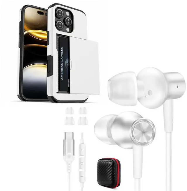 Jiunai for iPhone 16 Pro Case Card Holder + USB C Headphone for iPhone 16 Pro Magnetic Attached in Ear Type C Earbuds + Wallet Case for iPhone 16 Pro 6.3 '' Silver