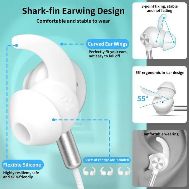Secure & Comfortable Fit: Features soft silicone ear tips, shark-fin ear wing design provides stable support & anti fall & no hurt & comfortable & lightweight, ideal for workouts, running or commuting, long-term wear; The 5-foot extended thickened cord provides you with more durable and flexible convenience