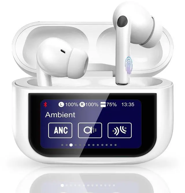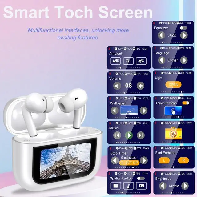 Smart Touch Screen - More Convenient: The Wireless Earbuds noise cancelling bluetooth headphones feature a multifunctional touch screen charging case. Sensitive and Responsive Touch Control for you a smooth user experience. Allowing you to operate it on the screen: Such as play/pause music, Equalizer; Ambient; Spatial Audio; Volume; Brightness; Control Camera of phone ; Wallpaper; Stop Time; Touch to wake; Light; Language; answer or reject calls; set alarm; and even you can locate your earbuds directly by the "Find Earbudsfunction on the charging case no need for phone!