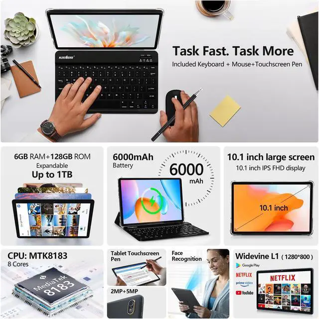 Use up to 128GB ROM + 6GB RAM Memory to increase your tablet's performance and run all your apps smoothly. Expand your storage up to 1 TB with a Micro SD card. There is plenty of room for keeping all your favorite videos, works, photos and files.