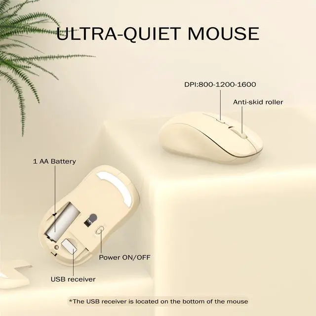 KEQTFT Wireless Keyboard and Mouse Combo, 110 Round Quiet Keys, Adjustable Optical Mouse, Share 1xUSB Receiver, Power Switch, for Windows Mac (Khaki)