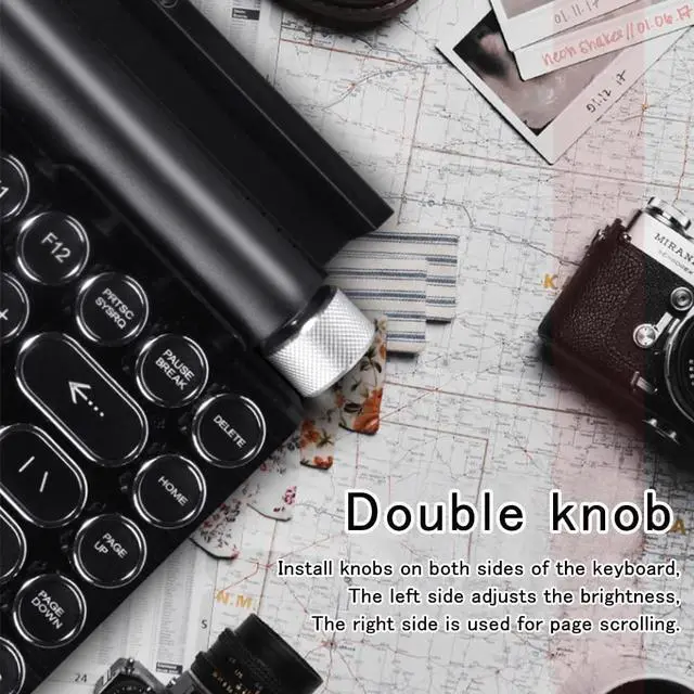 • Combination of fashion and retro: Continuing the retro elements of the typewriter, there will be a clicking sound when typing, the left and right sides are set with stylish texture knobs, the left side adjusts the brightness of the backlight, and the right side scrolls the page.