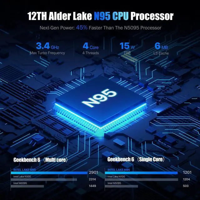 FAST AND POWERFUL 12TH N95 - Equipped with the latest 1.2GHz GPU, a turbo frequency of up to 3.4GHz, lower power consumption than the N100 and N97, and 27% faster performance than previous generations, Trycoo N95 Mini PC features a 4C/4T, 6MB L3 cache and a 15W TDP (6W default, 15W max)design, making it an ideal for streaming, multitasking, and light design editing.